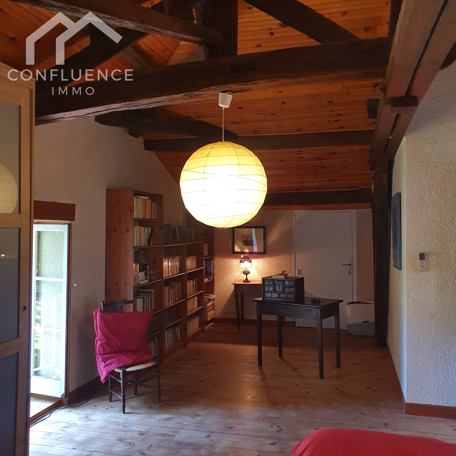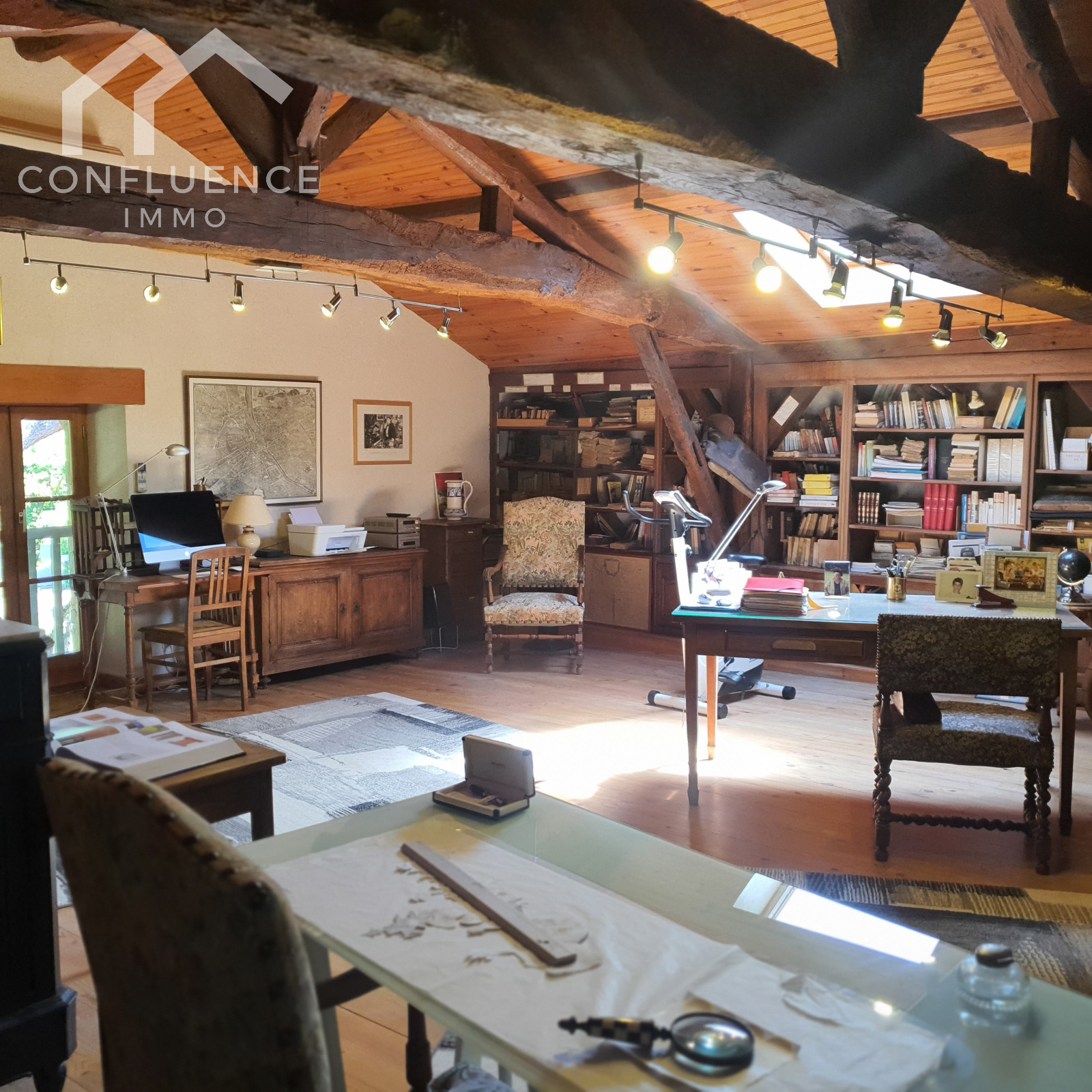 Un vaste couloir-dégagement répartit les espaces de nuit, salle de jeux et bureau . Au total la bâtisse dispose de 3 WC, 1 Salle de Bains, 1 Salle d'eau, 1 cabinet de toilette, 4 chambres dont 1 avec boudoir et 1 salle de jeux en rez de chaussée, à l'étage deux très belles pièces actuellement en bureau-bibliothèque pour l'une et chambre pour l'autre offrent deux espaces privatifs qui peuvent être aménagés en chambre-dortoir ou redécoupées .