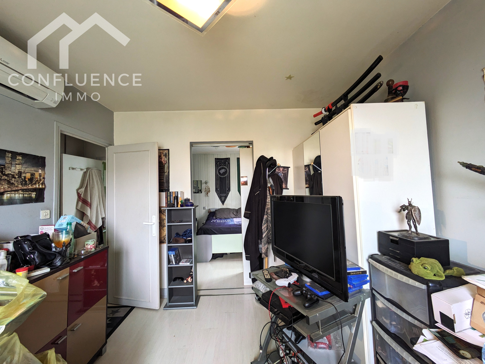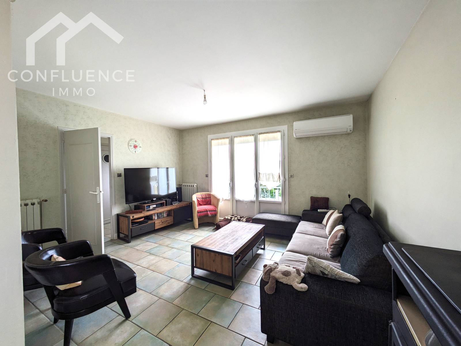 A l'étage, vous découvrirez un salon/salle à manger avec une climatisation réversible et un poêle à bois donnant sur une cuisine semi ouverte (toute équipée). L'espace nuit, quant à lui, propose une salle d'eau fonctionnelle, des WC séparés et une double chambre de plus de 20m² (actuellement partie nuit + espace dressing/bureau).