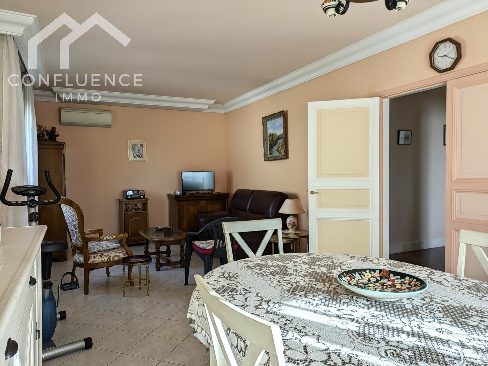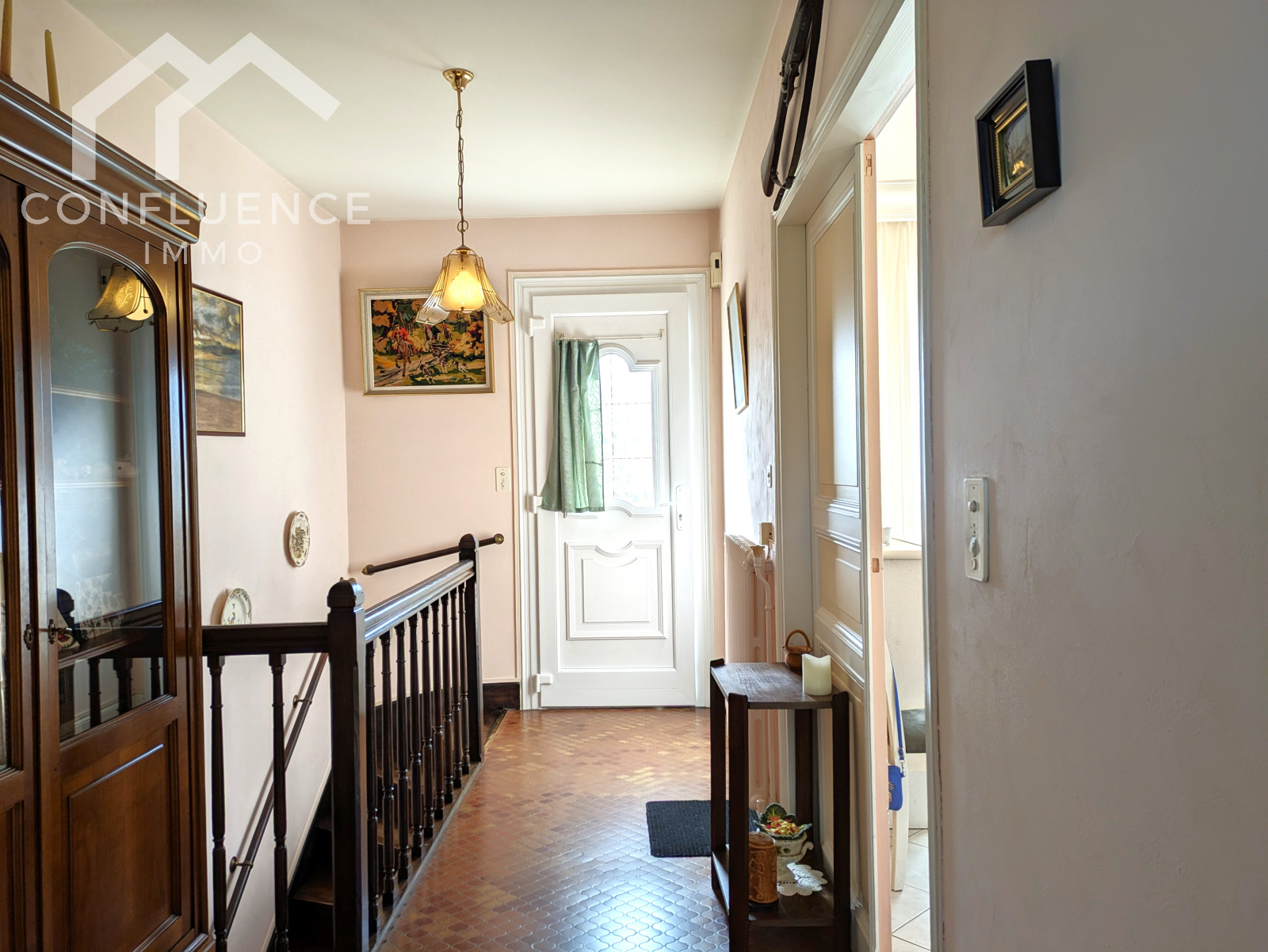 En empruntant le bel escalier en bois, vous arriverez dans une entrée lumineuse qui dessert un salon/salle à manger agrémenté d'une climatisation réversible, une cuisine indépendante (à moderniser), une salle d'eau avec douche à l'italienne, des WC séparés, trois chambres.