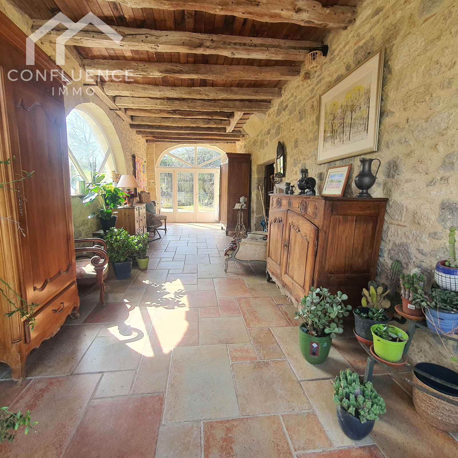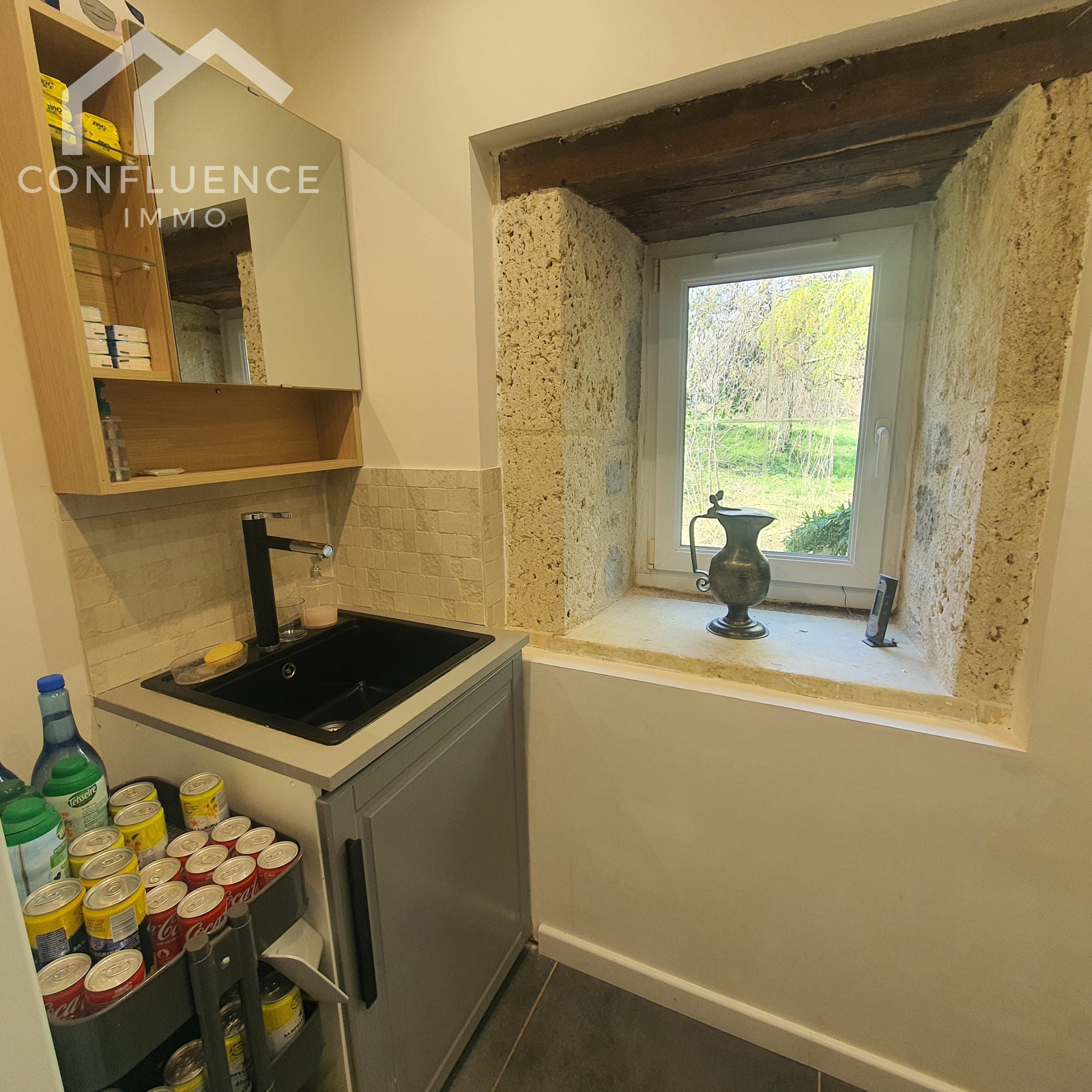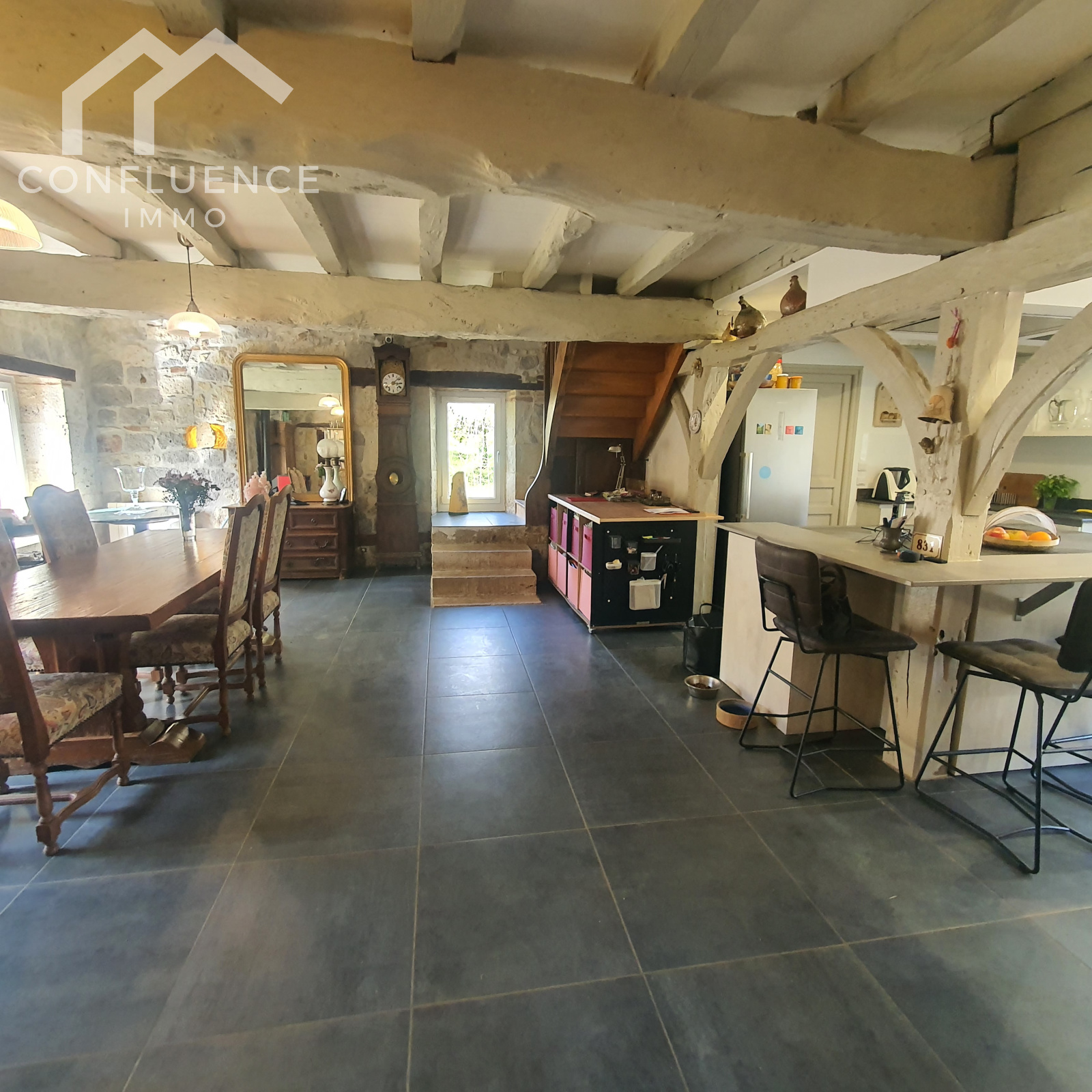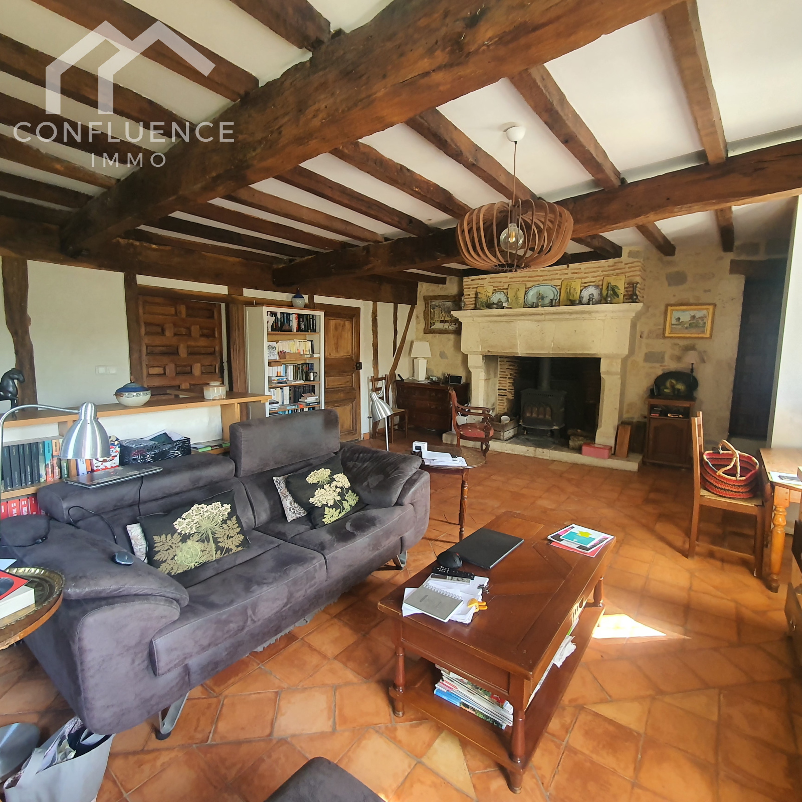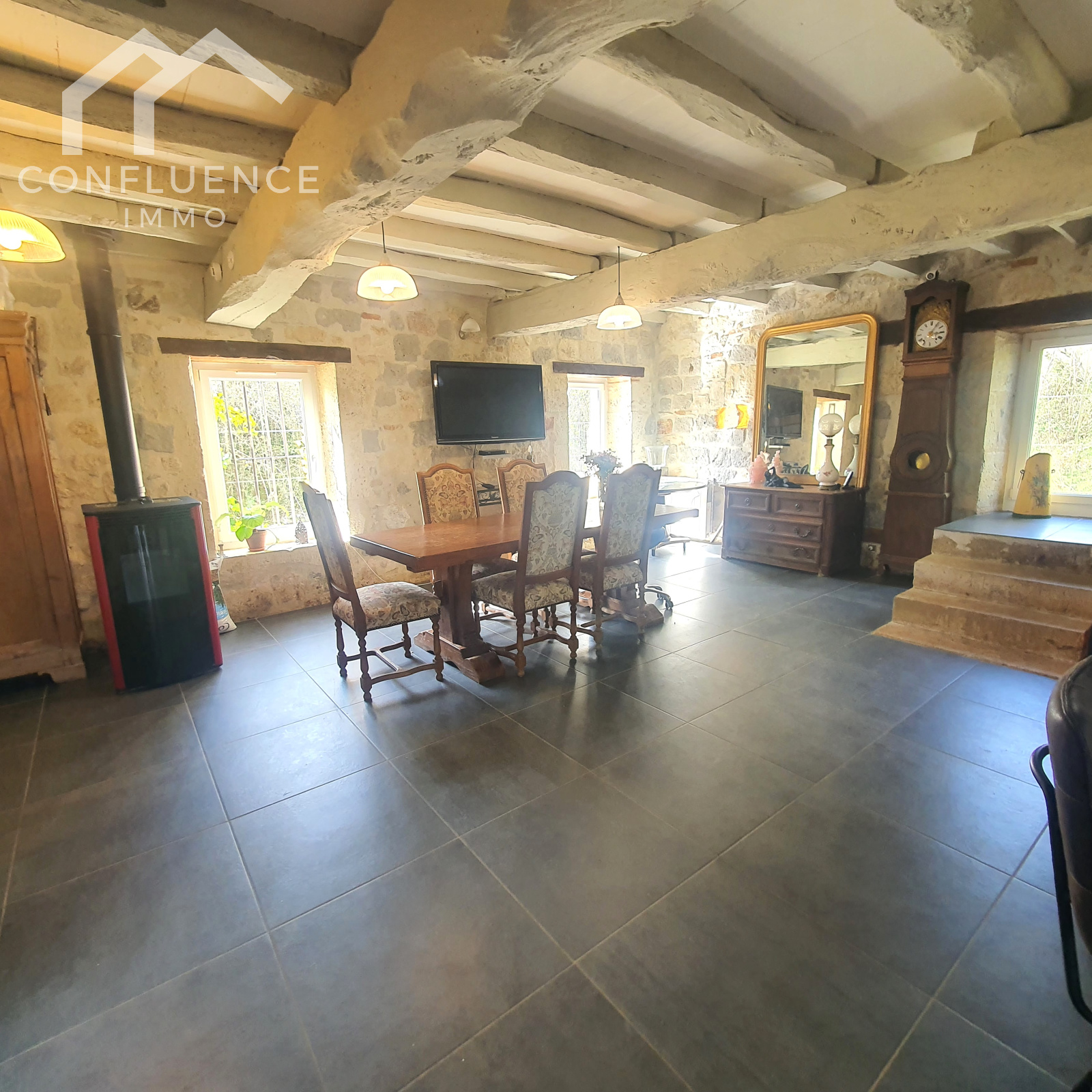 cheminée en pierres avec poêle en fonte évier en pierre tomettes 5.35*7.13